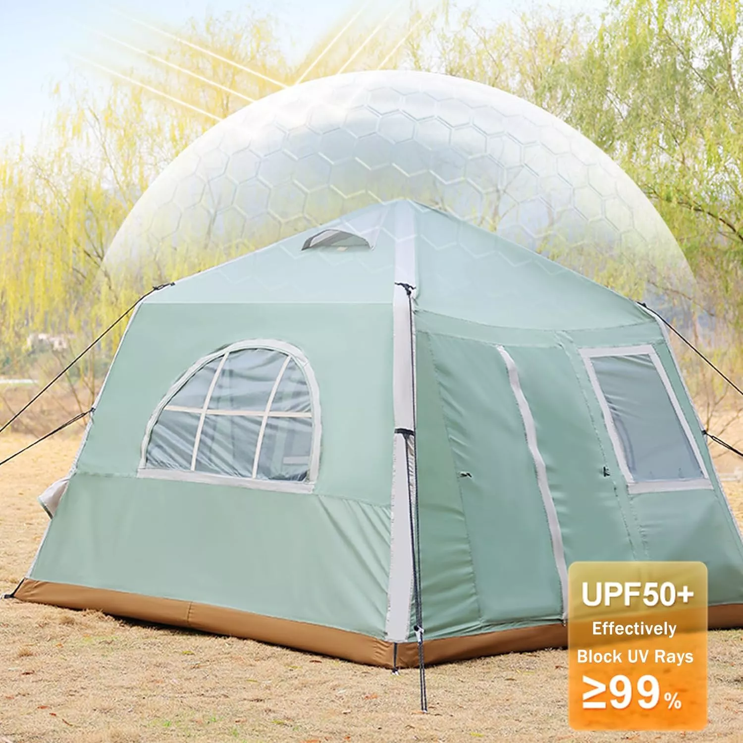 I've always been an outdoor enthusiast and I can say without a doubt that this tent has met all my expectations. It's not just about the functionality, but also the ease of use. The automatic opening system is a real time-saver - it allowed us to set up quickly, giving us more time to enjoy our. The double-layer construction coupled with fiberglass poles ensures stability and durability which is essential for any outdoor gear. Despite its spacious interior accommodating up to 8 people comfortably, it remains compact enough making it easy to carry around during our hiking trips. We particularly loved how well-thought-out the design was offering both a bedroom for privacy and a living room for communal activities – perfect balance! And let's not forget about style – its bean green color blends seamlessly with nature adding that touch of elegance we were looking for.