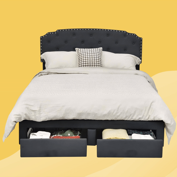 I've been on the lookout for a bed that offers both style and function, and this one fits the bill perfectly! The linen-upholstered headboard with button tufting adds an air of sophistication while its four spacious drawers provide ample storage space. Its sturdy build apparently supports up to 660 lbs without any signs of strain or wobble!