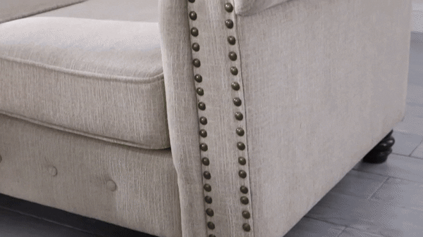 This sofa is crafted with 100% polyester fabric that not only ensures durability but also provides a luxuriously soft feel. The elegant scrolled arms add a touch of class and provide a comfortable place to rest. With its deep button tufting and tasteful nailhead accents, each detail is carefully applied by hand to deliver a unique and artisanal touch to your home.