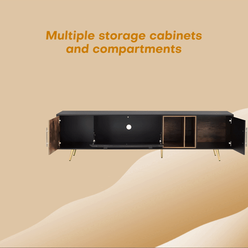 • Durable Construction: Crafted from high-quality MDF board, this TV stand is built to last, promising years of reliable use. The sleek metal handles and legs feature a stunning gold finish, adding a touch of luxury to your space.