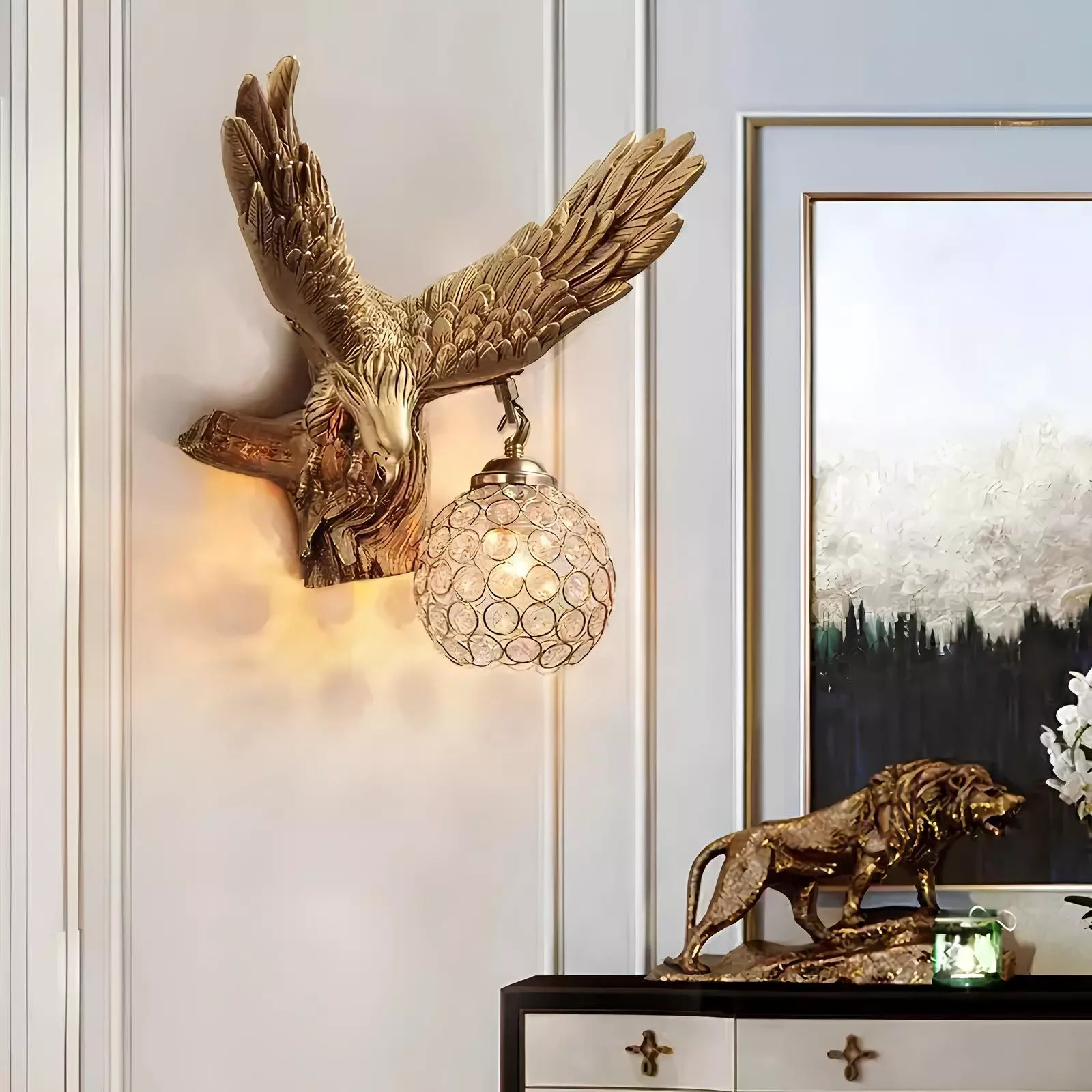 Embrace the blend of functionality and artistry with our Modern Gold Eagle Wall Lamp. Enhance your home with its warm glow and elegant design today. If you have any questions, our customer service team is here to assist you around the clock. Illuminate your space with style and sophistication. Add to cart now and transform your living experience!