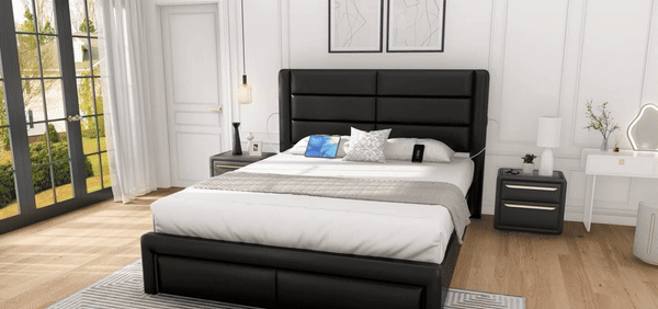 Transform your bedroom into a haven of comfort and functionality with our Modern Black Leather Upholstered Platform Bed. Designed to support your modern lifestyle, this bed combines luxurious comfort with cutting-edge convenience, making it the perfect addition to any contemporary home.